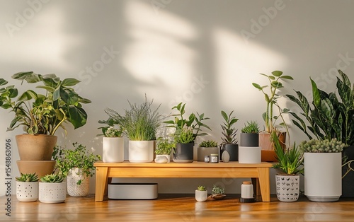 Interior shot of potted plants arranged on wood floor and shelf, lit by sunlight