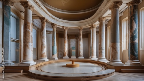 Interior view with circle floor and marble columns. Tall building has cream walls and ceiling with circular design near top. Light enters through windows.