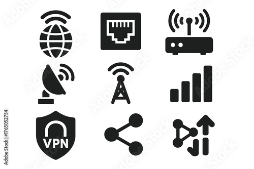 Internet Connectivity Icons. Solid style icons of internet connectivity: WiFi globe, ethernet port, router with waves, satellite