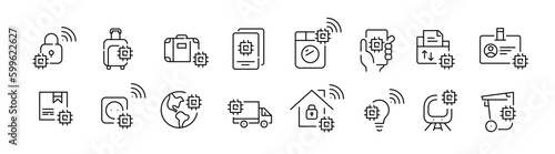 Internet of things. Microchip, sensors and networking, exchange data and remote control. Pixel perfect, editable stroke