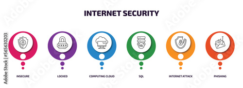internet security infographic element with outline icons and 6 step or option. internet security icons such as insecure, locked, computing cloud, sql, internet attack, phishing vector.