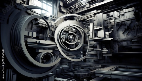 interplay of geometric forms in motion within an industrial setting. The image showcases the dynamic and abstract shapes created by the movement of industrial machinery or equipment
