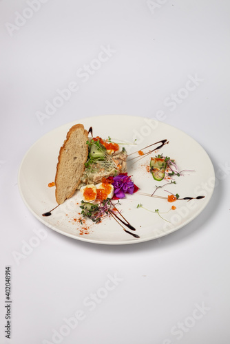 interpretation of olivier salad with grilled chicken fillet, quail eggs and red caviar, on a white background.