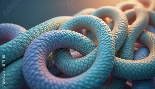 Intertwined, scaled ropes form a mesmerizing, abstract sculpture with a soft, ethereal glow. Graphical resource for design and downstream advertisement purposes