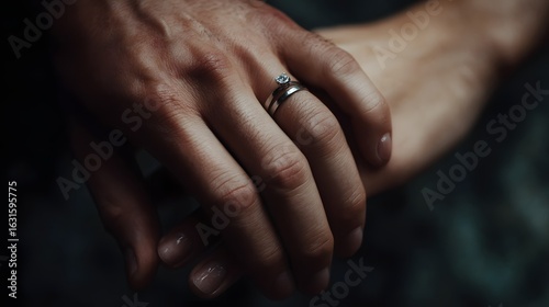 Intimate hands holding wedding rings in soft lighting