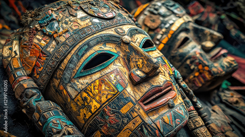Intricate ancient masks showcasing vibrant colors and detailed carvings, surrounded by cultural artifacts