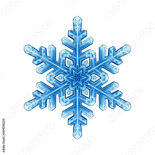 Intricate blue crystalline snowflake with six symmetrical arms detailed with frost and ice textures isolated on transparent background
