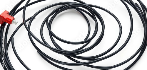 Intricate coil of black electrical wire, isolated on white, electrical wire, electricty cable