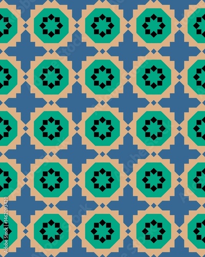 Intricate design showcases repeating geometric shapes in green, black, and beige against a deep blue backdrop