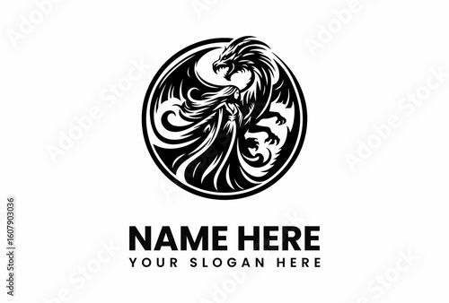 Intricate Dragon and Woman Silhouette Within a Circular Emblem Design.