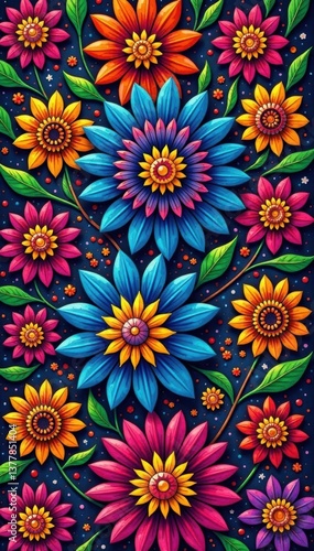 Intricate floral circle patterns, vibrant colors, wheel, sun
