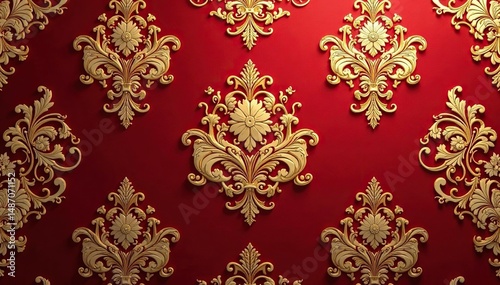 Intricate floral damask pattern in elegant gold on deep red background , graphic design, background pattern