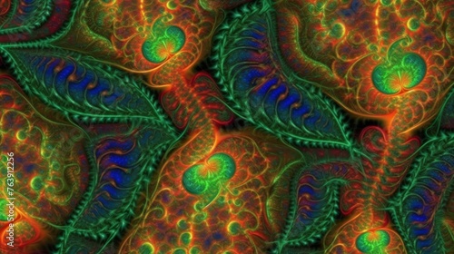 Intricate fractal patterns with a psychedelic color scheme featuring deep reds and vivid greens, exuding a mystical and complex beauty