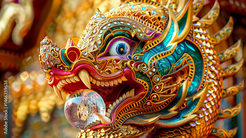 Intricate Golden Dragon Sculpture with Colorful Detail and Glossy Ball