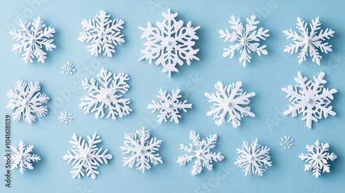 Intricate large snowflakes set against a light blue backdrop for a festive winter theme