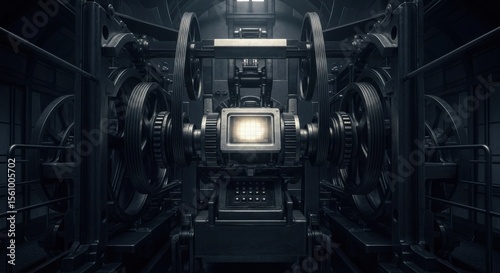 Intricate Mechanical Device with Central Glowing Screen in Industrial Setting