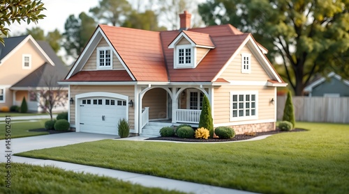 Intricate origami style, classic American suburban home, manicured lawn, two-car garage, friendly neighborhood, folded paper, geometric precision