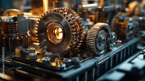 Intricate rotating gears displaying precision engineering in an advanced industrial factory