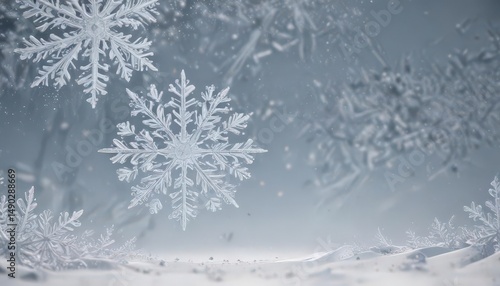 Intricate snowflake border, large & small flakes on snowy background, season, crystal, illustration