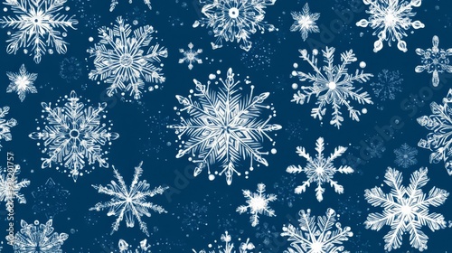 Intricate snowflake pattern with delicate details, flat , minimalist style, white on blue, clean lines
