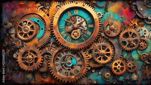 Intricate steampunk-style clockwork gears and timepieces form a vibrant, textured background.
