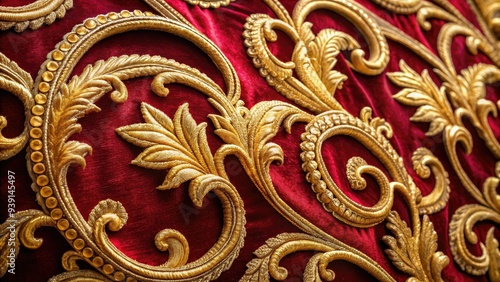 Intricate, swirling gold embroidery lines accentuate the edges of a lavish, crimson velvet fabric, evoking opulence and sophistication in ornate, Baroque-inspired design.
