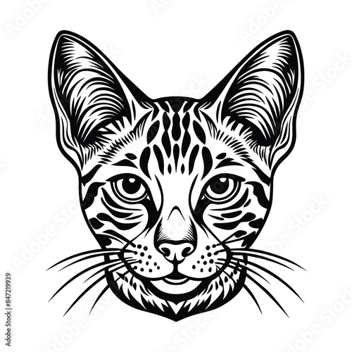 Intricate Vector Illustration of a Savannah Cat Head with Detailed Patterns and Bold Lines in Black and White, Perfect for Tattoo Designs and Art Prints