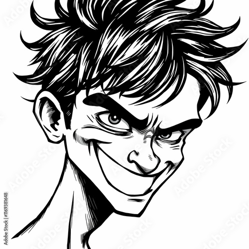 Intriguing, mischievous, and slightly sinister: A close-up illustration of a man's face with a mischievous smile, his eyes gleaming with mischief. His hair is styled in a chaotic, edgy manner.