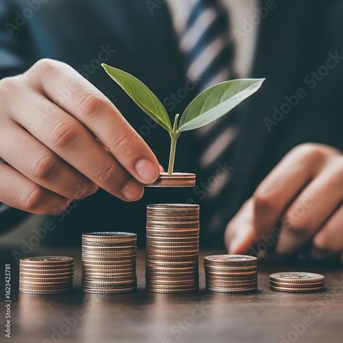 Investment Growth Concept Businessman Hand Placing Coins with Plant Sprout Rising from Money Stack Symbolizing Financial Success and Sustainable Business Practices