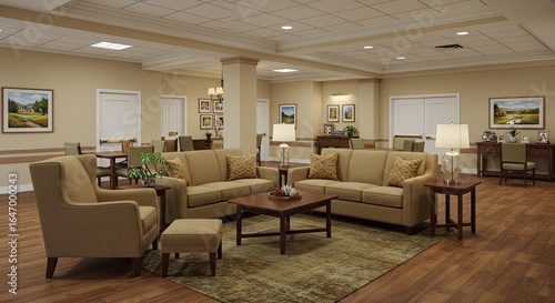 Inviting and comfortable living room interior design with elegant furniture and artwork, perfect for senior living facilities, retirement homes, or assisted living spaces