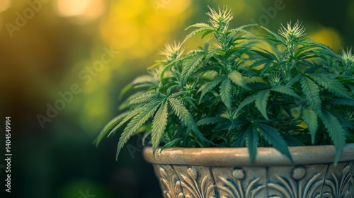 Inviting Cannabis Plant in Decorative Pot on a Sunny Day