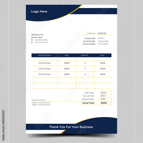 Invoice design template.Invoice minimal design. Bill form business invoice. Business Invoice.money bills.price invoices