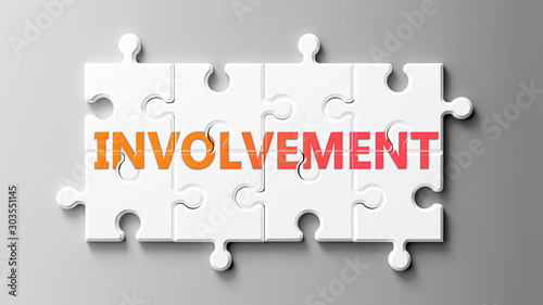 Involvement complex like a puzzle - pictured as word Involvement on a puzzle pieces to show that Involvement can be difficult and needs cooperating pieces that fit together, 3d illustration