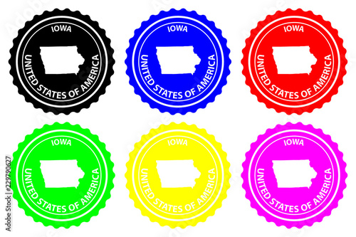 Iowa - rubber stamp - vector, Iowa (United States of America) map pattern - sticker - black, blue, green, yellow, purple and red