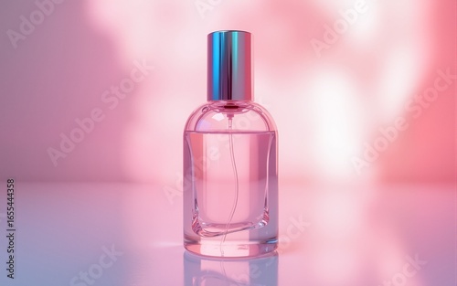 Iridescent Perfume Bottle in Soft Pink Light. High quality