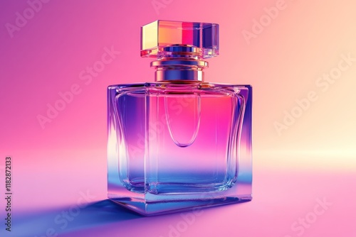 Iridescent perfume bottle studio shot, pink backdrop, product advertising