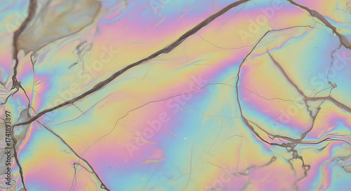 Iridescent surface with cracked texture revealing vibrant rainbow colors and light