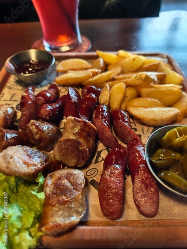 Irish sausages with potato wedges, jalapeno and dipping sauce served on a rustic wooden board in a pub setting. Warm, hearty comfort food with a classic European pub vibe.