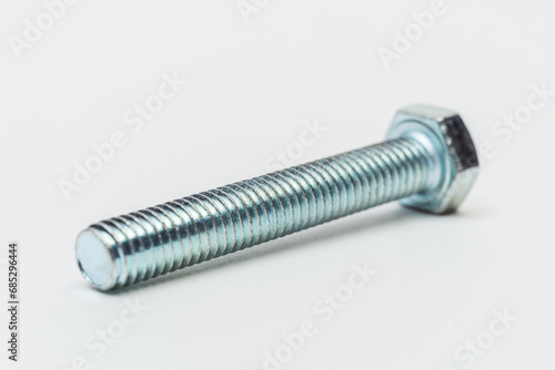 iron bolt on a white background. metal bolt on a light background. photos of a threaded bolt for the catalog