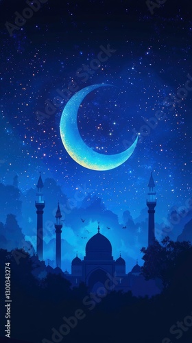 Islamic illustration of a crescent moon behind a mosque silhouette with a night sky background. Use a dark blue color for the overall design
