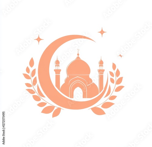 Islamic Mosque Silhouette within Crescent Moon, Floral Wreath, Graphic Design