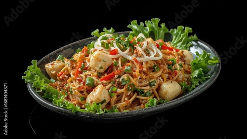Isolated black background showcasing chicken Caesar salad with an Asian twist
