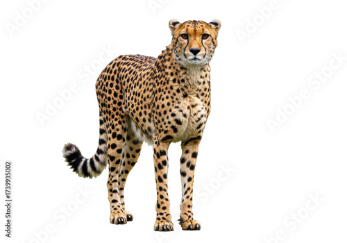 Isolated Cheetah stands looking at the viewer, in a natural habitat, focused, intense gaze
