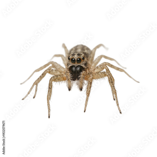 Isolated jumping spider with tucked legs ready to jump