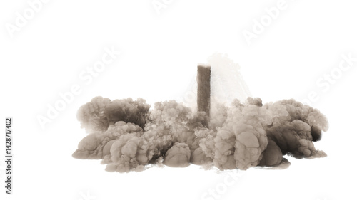 Isolated Large billowing plume of smoke rising from a central source with smaller clouds dispersed around it on uniform background