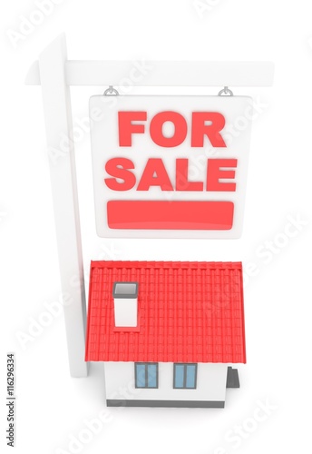 Isolated model of house with for sale sign on white background. Good investment in real estate. Buy new apartment. 3D rendering.