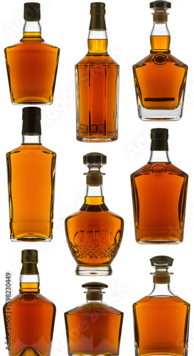 Isolated Set of Nine Glass Bourbon Whiskey Bottles on Transparent Background