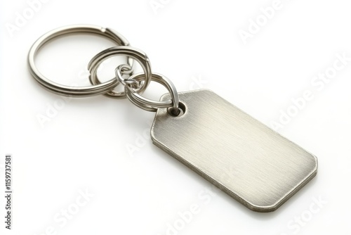 Isolated silver military dog tags on a small keychain against a white backdrop