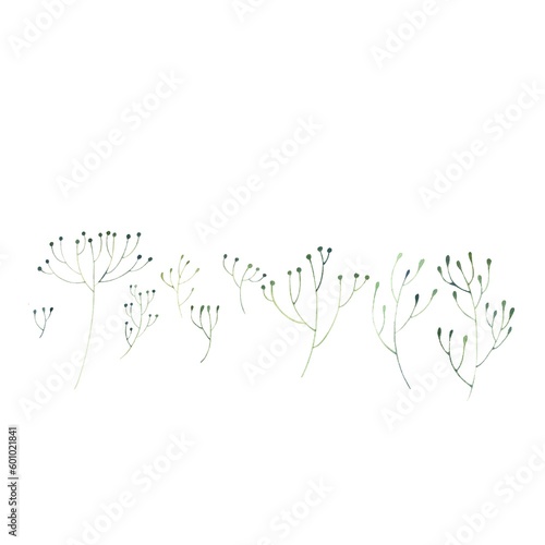 isolated, sprigs of herbs drawn in watercolor in hand technique, abstract green herbs, a set of herbs, branches with leaves, blades of grass