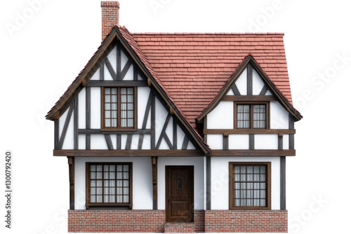 Isolated Tudor Style House With Transparent Background Shows Red Roof and White Walls Brown Timber Frame and Symmetrical Windows